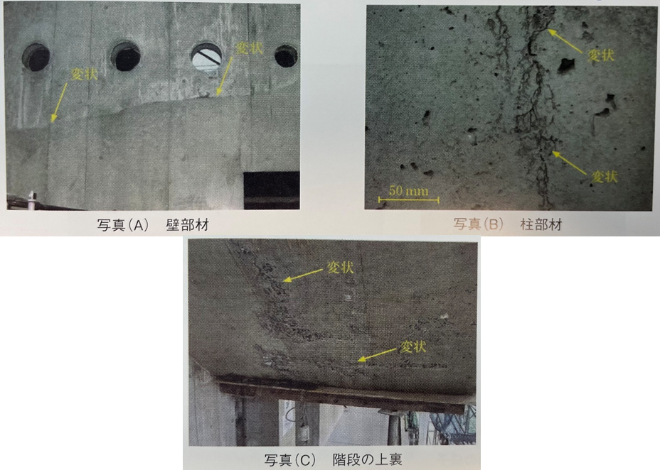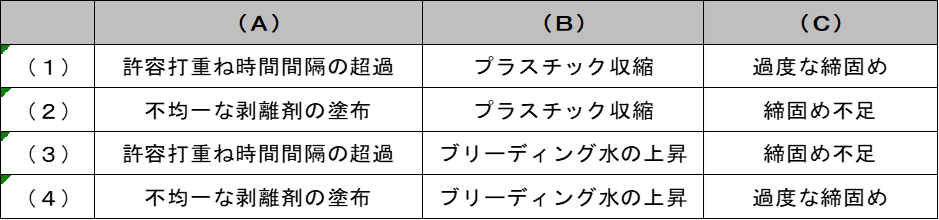 写真(A)の変状は、コールドジョイントである。許容打重ね時間間隔の超過や、下層へのバイブレータの挿入不足が考えられる。写真(B)は砂すじである。生コン打設時のバイブレータによる締固め時に、ブリーディング水が上昇し、型枠の継ぎ目から漏水したものと考えられる。写真(C)は、豆板(ジャンカ)である。コンクリート打ち込み高さが高く、材料分離した状態で打設した場合や、締固め不足で生じる。