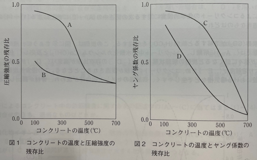 加熱前(20℃)の圧縮強度が30N/㎜2、ヤング係数が28kN/㎜2のコンクリートを加熱した際の、コンクリートの温度と圧縮強度の残存比の関係を図1に、コンクリートの温度とヤング係数の残存比の関係を図2に示す。それぞれの曲線の外形(A~D)の組合せとして、次の(1)~(4)のうち、適当なものはどれか。