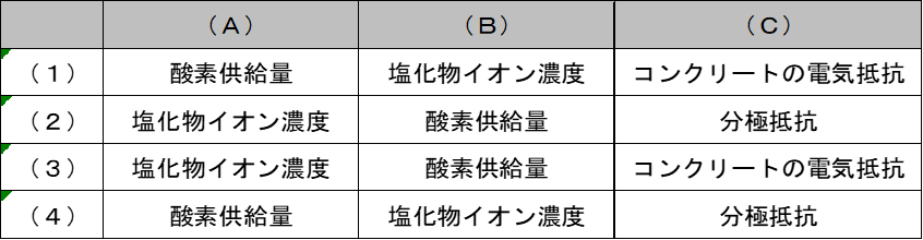 図1は塩化物イオンが存在するコンクリート中の鉄筋の腐食を説明する概念図であり、図2は腐食が生じている部位で測定した分極曲線の概念図である。コンクリート中の鉄筋の腐食速度に関する次の記述中の(A)~(C)に当てはまる(1)~(4)の語句の組合せのうち、適当なものはどれか。