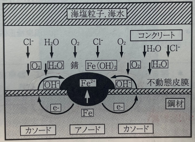 コンクリート中の鉄筋などの鋼材腐食は、電子やイオンの移動を伴う電気化学的反応である。塩化物イオン等の劣化因子により、コンクリート中の鋼材の不動態被膜が破壊された部分で、アノード反応(鋼材から鉄イオンが失われ、コンクリート中に溶け出ていく。酸化反応ともいう。)が起きる。鋼材内に残された鉄イオンを失った電子は、カソード域に移動し、そこで、コンクリート中の水や酸素と結合し、カソード反応(還元反応ともいう。)により、水酸化物イオンとなる。そして、コンクリート中に溶け出た鉄イオンと水酸化物イオンが反応して鉄の水酸化物(錆)となる。
