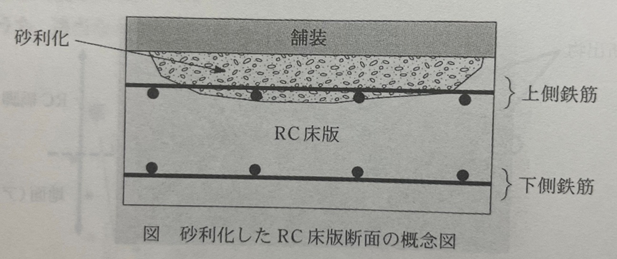 問題文にある、凍結融解作用による砂利化(土砂化)のほか、乾燥収縮荷重作用により発生したひび割れが貫通することにより、路面からの浸透水によりひび割れ面の摩耗が促進されるとともに、鉄筋コンクリート床版上縁の圧縮側コンクリートを分離させる骨材化現象をもたらすことから、更に疲労が促進される劣化もある。
