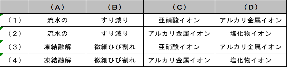 寒冷地に位置する鋼単純桁橋のRC床板上面に、下図に示すような砂利化(土砂化)が見られた。砂利化が生じた原因に関する次の記述中の(A)~(D)に当てはまる(1)~(4)の語句の組合せのうち、適当なものはどれか。